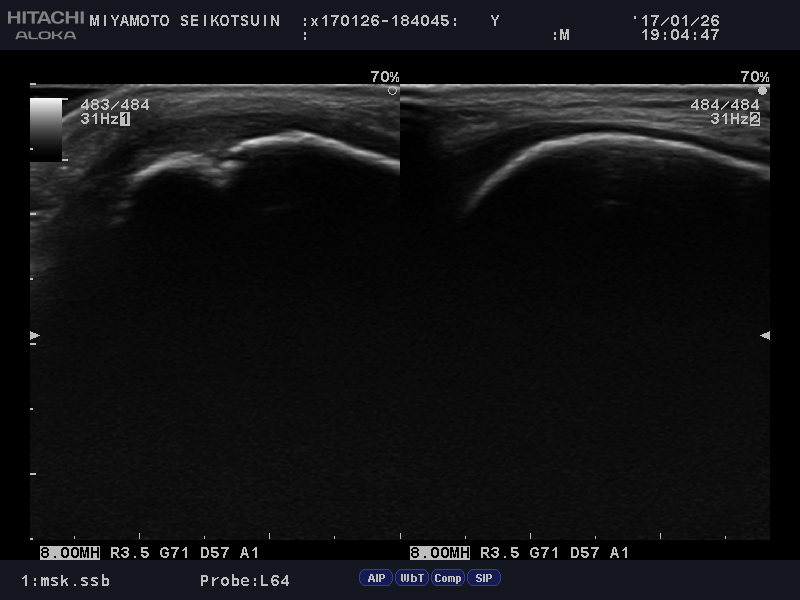 当院では、痛みの原因を正しく把握するために、エコー(超音波)検査を活用しています。レントゲンでは骨の形状はわかりますが、エコーを使うことで、骨の分裂状態だけでなく、周囲の軟部組織の炎症までリアルタイムで確認が可能です。